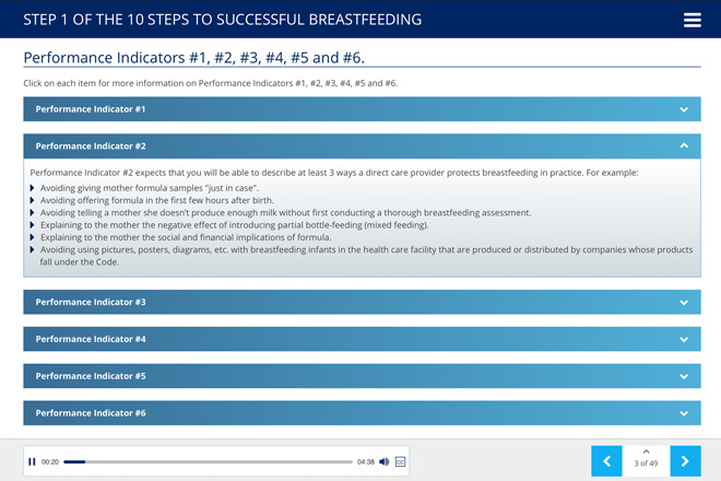 Maps directly to the updated 2018 WHO/UNICEF Baby-Friendly Hospital Initiative objectives and takes the user through each step and associated performance indicators demonstrating competency required for US criterion evaluation.