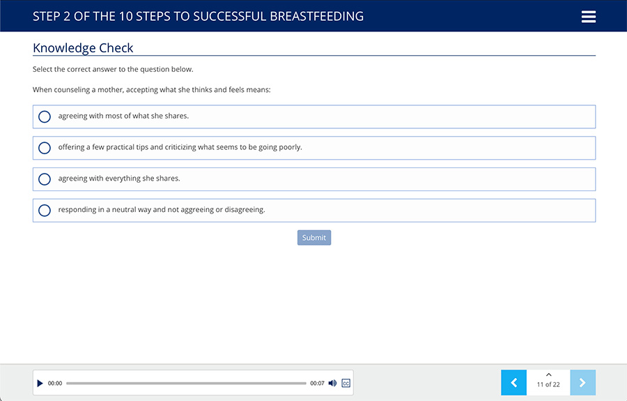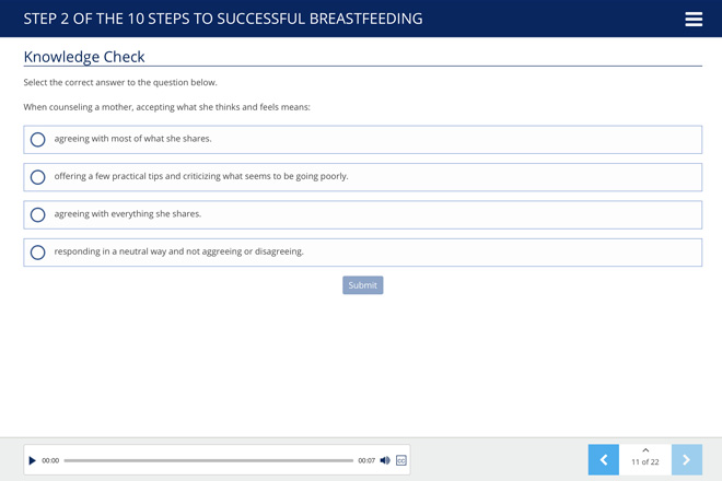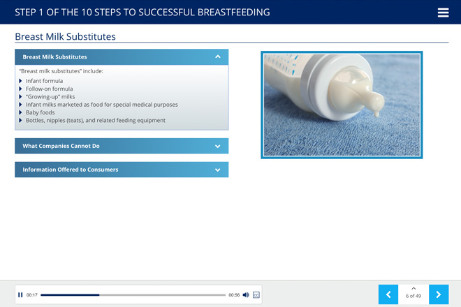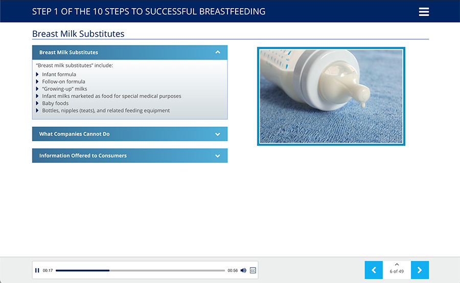 Ten Steps to Successful Breastfeeding Online Course earns 15 Contact Hours, which can be completed at one’s own pace, 24-hours a day. As a user progresses through the course, they will encounter Knowledge Checks that measure their understanding of the subject matter. After completing the course, they can print out a completion certificate that grants the earned Contact Hours.
