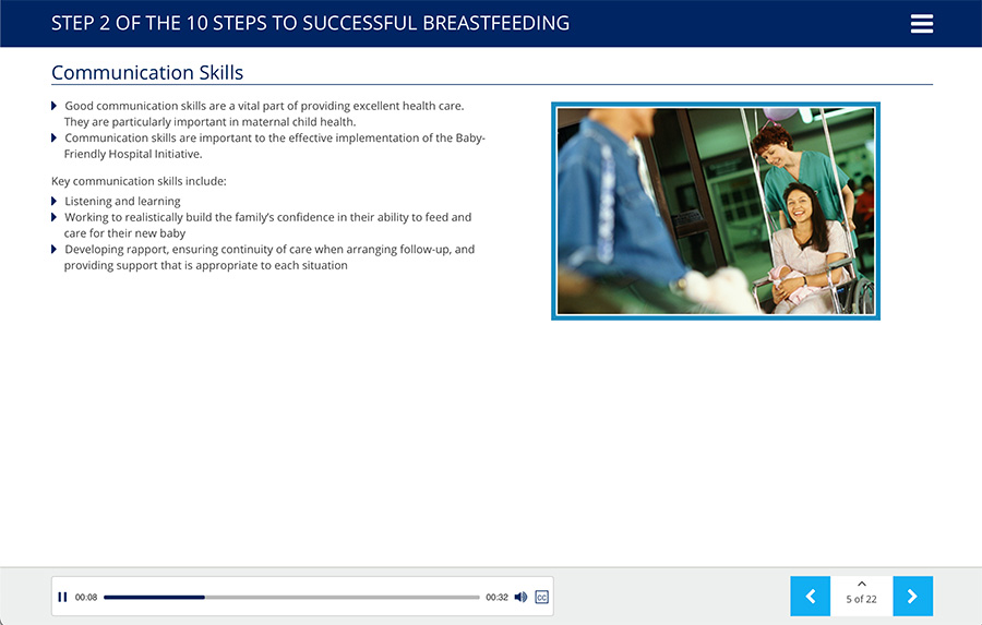 Created specifically to support the implementation of the World Health Organization (WHO) and UNICEF Baby-Friendly Hospital Initiative, Ten Steps to Successful Breastfeeding is an essential course for educating staff to reach Baby-Friendly status.