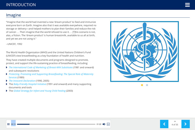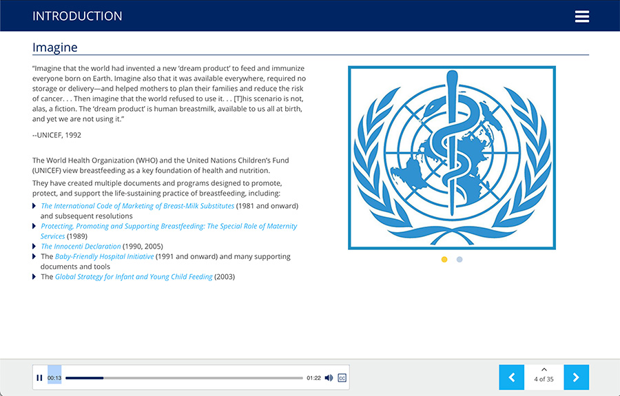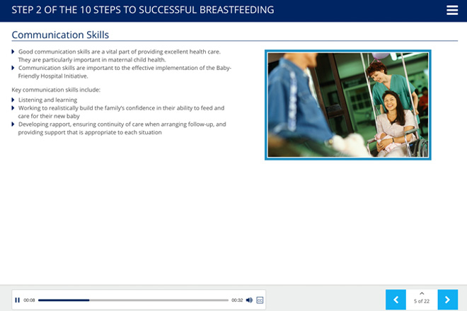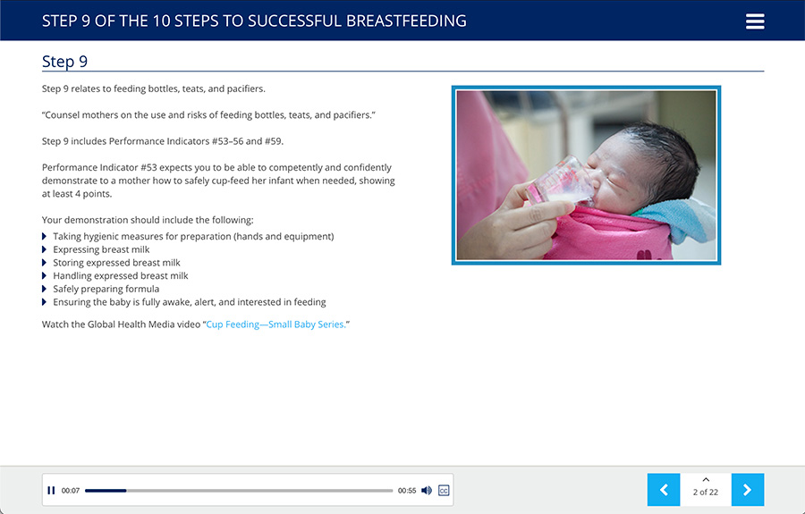 Ten Steps to Successful Breastfeeding Online Course is structured in 16 modules and maps directly to the updated 2018 WHO/UNICEF Baby-Friendly objectives and Baby-Friendly USA Guidelines and Evaluation Criteria, Sixth Edition. This competency-driven online course will ensure that all staff are prepared to work with parents and newborns to establish optimal feeding habits and provide appropriate care in the first critical days of the baby’s life.